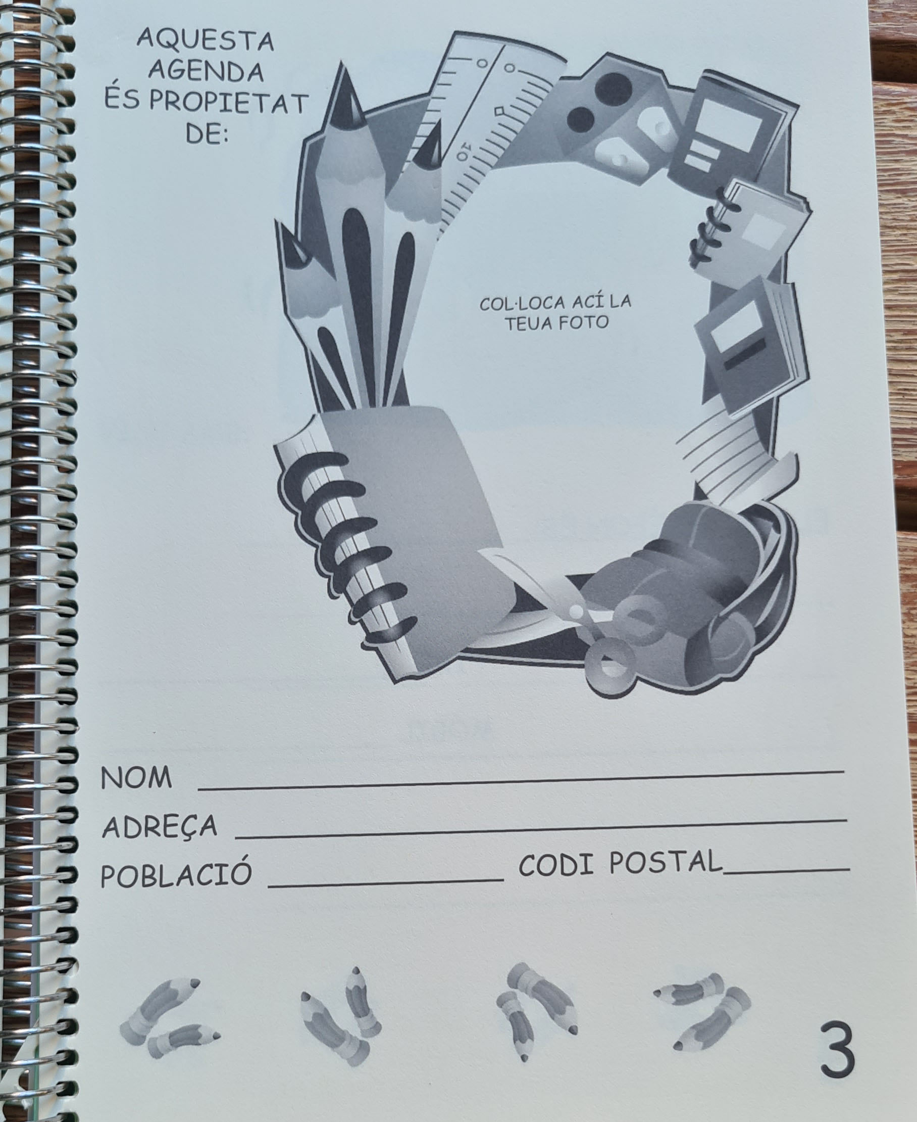 - Comença, com a totes les agendes del món, amb la identificació del propietari. Hi posem una foto de la xiqueta o del xiquet, i, individualment, emplenem la resta de camps. Altra manera de treballar aquest apartat es que el xiquet/a duga les dades personals de casa i que les explique als companys per copiar-les desprès a la seua agenda.